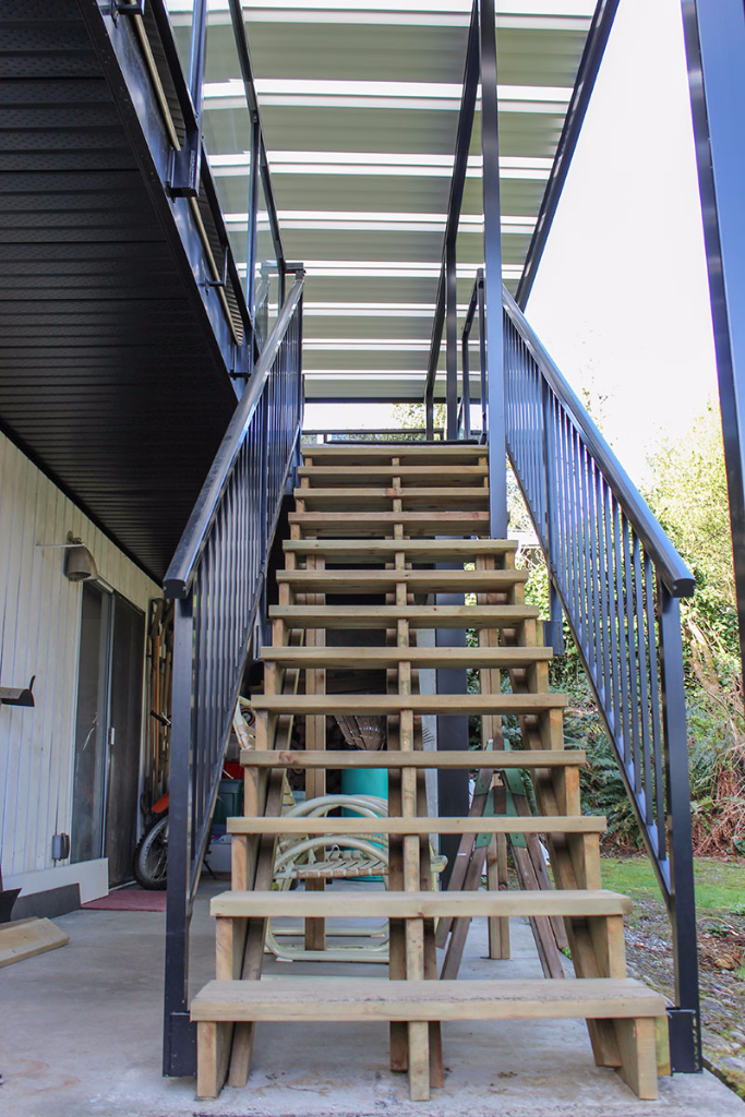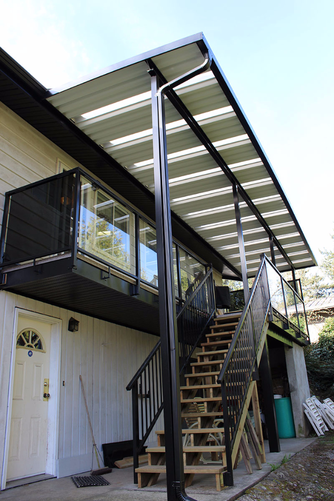 Cascade Roofing provided a comprehensive exterior renovation that combined contemporary style with enhanced safety features. The project included the supply and installation of a new shingle roof, sun tunnels for natural lighting, modern soffitting, durable vinyl decking, new steps, an aluminum canopy for weather protection, aluminum railings for safety, and a complete gutter and downpipe system for proper water management.